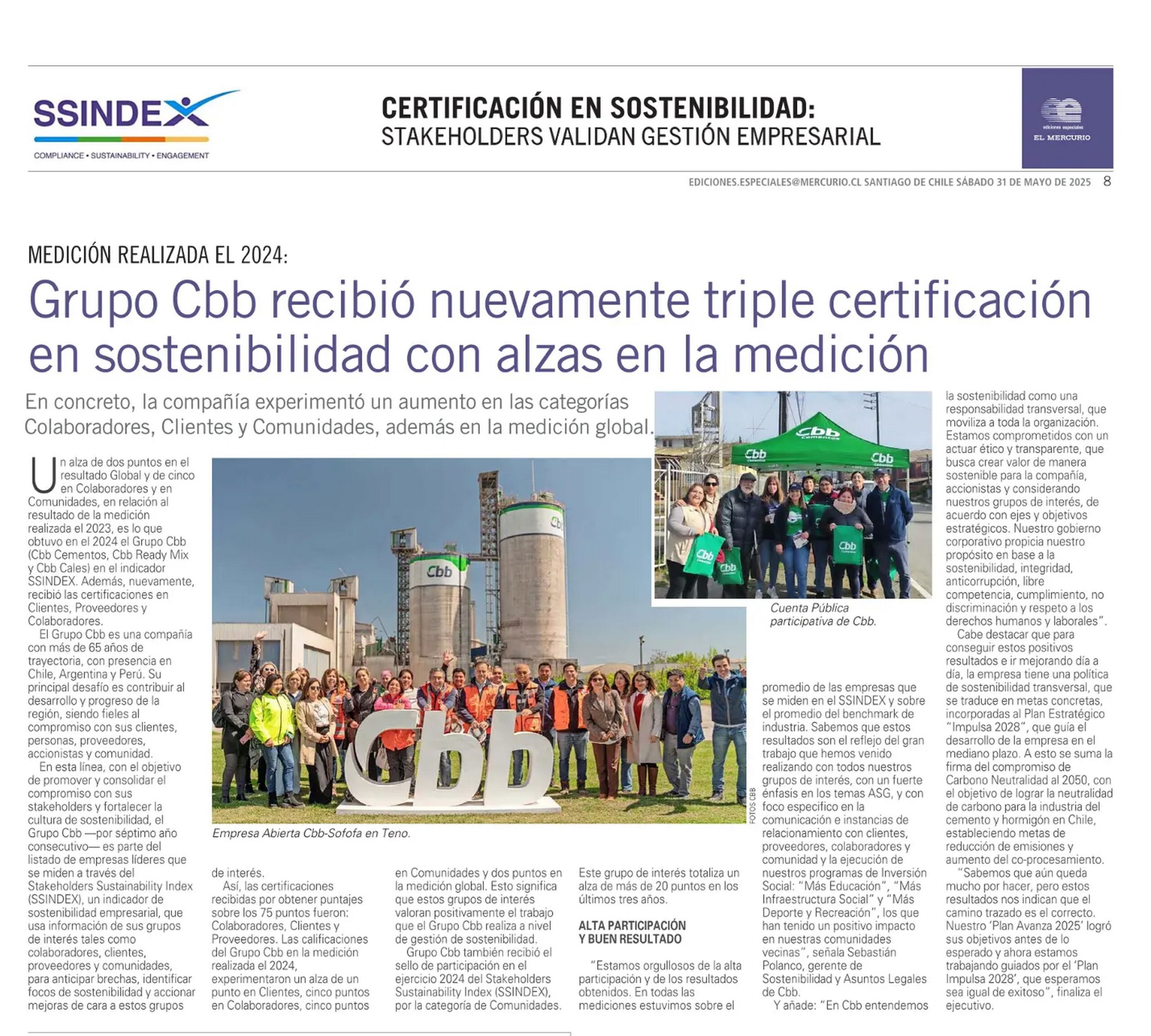 Un alza de dos puntos en el resultado Global y de cinco en Colaboradores y en Comunidades, en relación al resultado de la medición realizada el 2023, es lo que obtuvo en el 2024 el Grupo cbb (cbb Cementos, cbb Ready Mix y cbb Cales) en el indicador SSINDEX. Además, nuevamente, recibió las certificaciones en Clientes, Proveedores y Colaboradores.